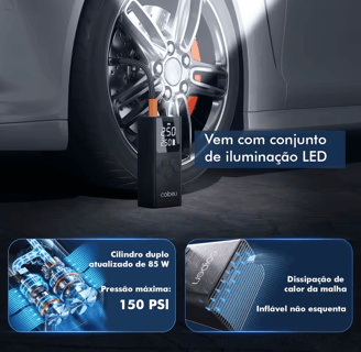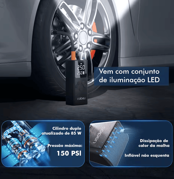 A Bomba de Ar Inteligente Portátil Coibeu combina potência, praticidade e tecnologia em um único dispositivo. Compacta e leve (apenas 650g), ela pode ser facilmente transportada no carro, mochila ou bicicleta, pronta para uso onde e quando você precisar.